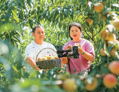 湖北省宜昌市秭归县利用山区独特的资源优势,在海拔600米以上的山坡地带,采取“公司+合作社+基地+农户”的方式,引导和鼓励农民在种植、加工、储运、销售等产业链条的多环节上获取红利,助力乡村产业振兴。图为秭归县郭家坝镇西坡村回乡新农人陈霞(右)和家人在果园直播销售锦绣黄桃。王罡摄(人民图片)