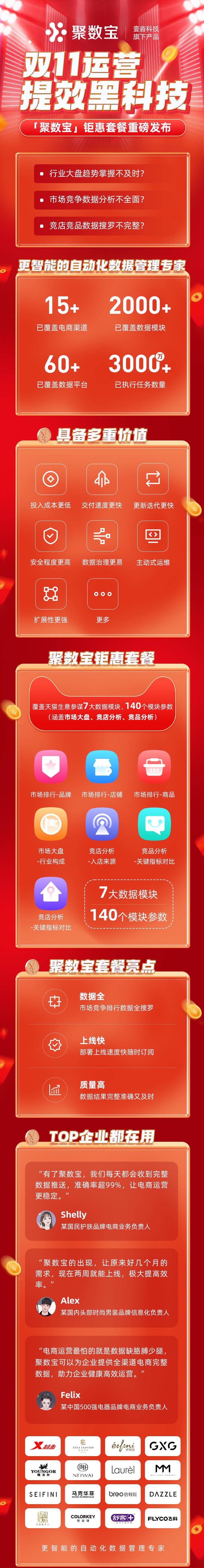 「聚数宝」生于新零售,颠覆RPA和连接器取数,为客户提供从数据聚合、治理、推送到维护等一站式服务,助力品牌沉淀全网高质量电商经营数据资产。